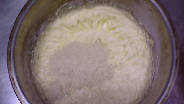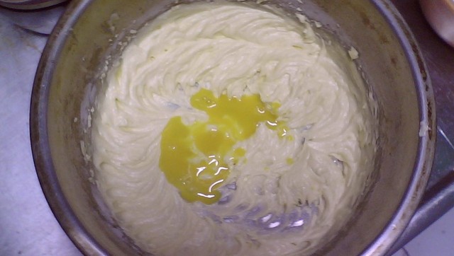3.蛋黃打散,分數次緩緩加入(要完全拌勻才可以加下一次的蛋)