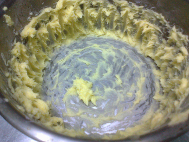 3. 分次加入全蛋液拌勻(確實拌勻後才可加下一次,以免油水分離)