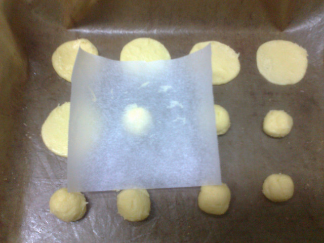 3. 蓋上一小張烤盤紙後用圓底的器具壓扁(我用的是茶葉罐蓋子)