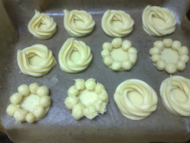 4. 剩餘麵糊填入擠花袋,在圓形餅乾周圍擠一圈